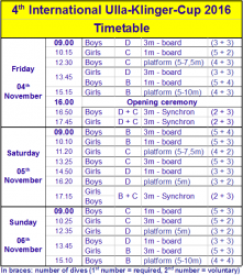 There will be a tight competition program at the Ulla-Klinger-Cup. For the first time it will be necessary to start two parallel competitions to get ready with all of them in time. Friday there will be the D class girls 3m in parallel with the B class boys on the 1m springboard. And sunday the D class boys will dive in parallel with the B class girls 3m.